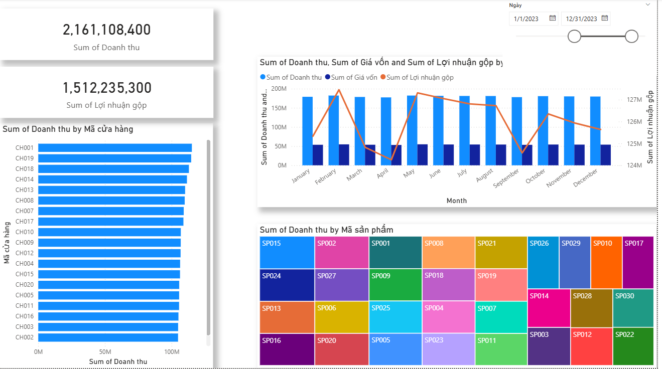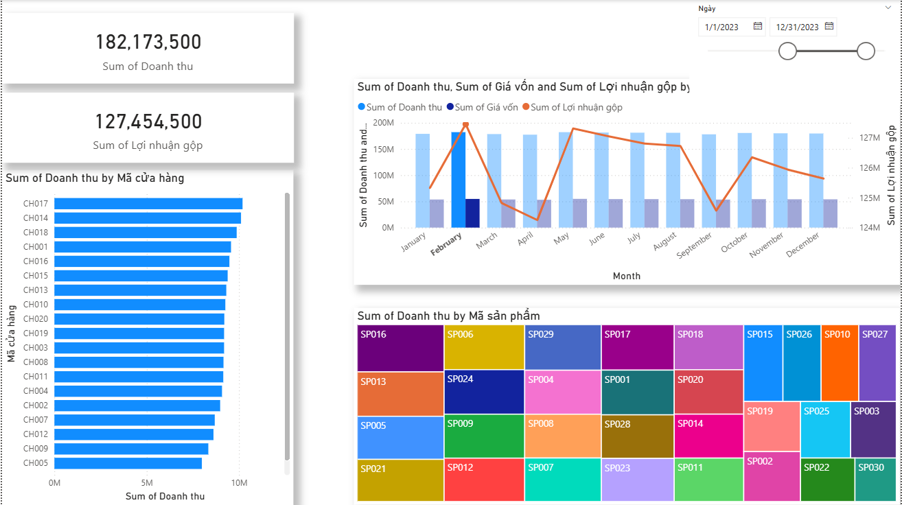 Monthly revenue, cost, and gross profit tracked across the full year. Performance broken down by store location and product SKU to surface where margins are strongest.