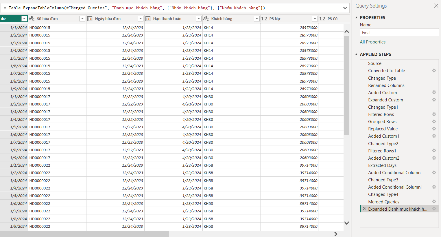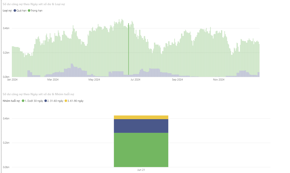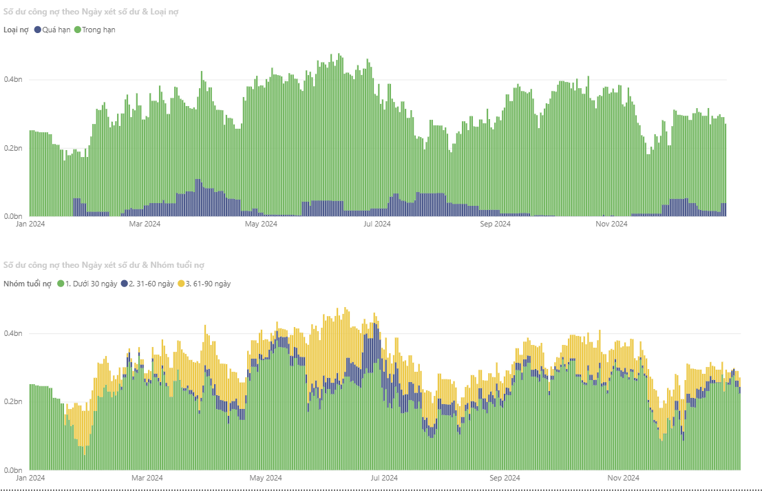 Daily receivables balance: current vs. overdue debt tracked accurately across the full year. Receivables systematically segmented by customer group and days outstanding.
