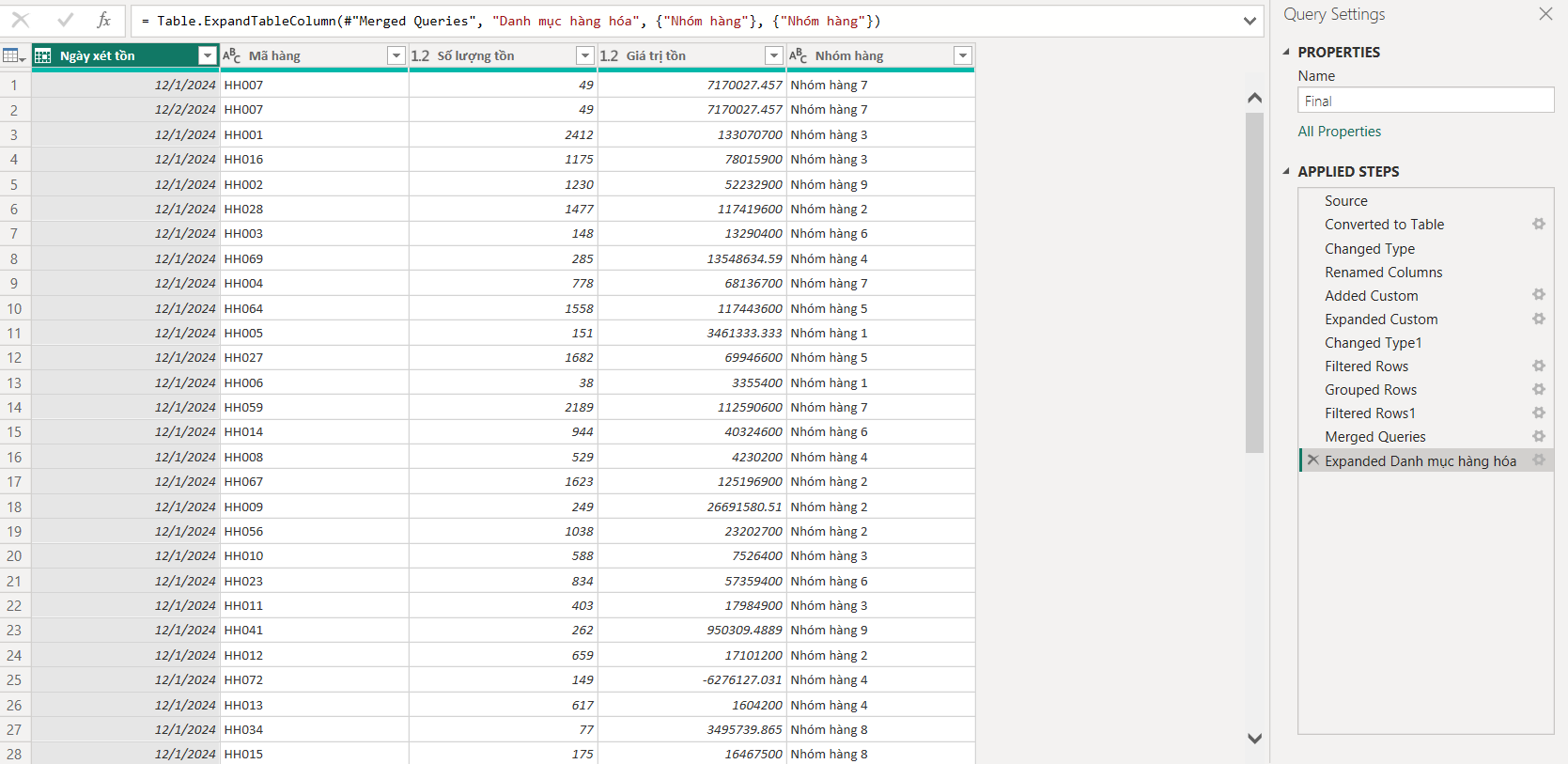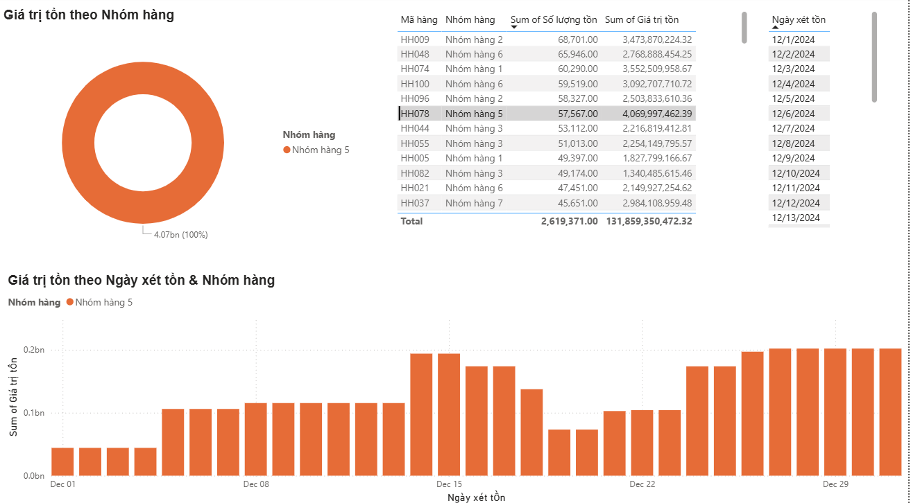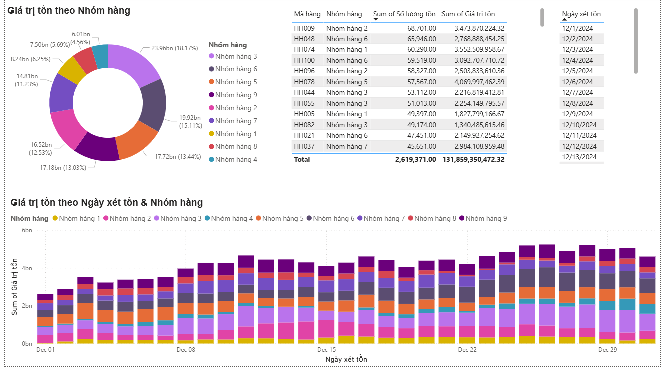 Inventory value by product group, visualizing distribution across categories as of the reporting date. Tracking stock value trends and movement velocity across December.